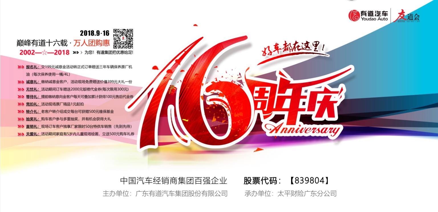 巔峰有道十六載·萬人團(tuán)購惠 2018年9月16日 有道汽車集團(tuán)十六周年慶 【巔峰有道十六載·萬人團(tuán)購惠】活動(dòng) 聯(lián)動(dòng)廣東·廣西·湖南三省百店 掀起優(yōu)惠風(fēng)暴,制作鉅惠盛宴...