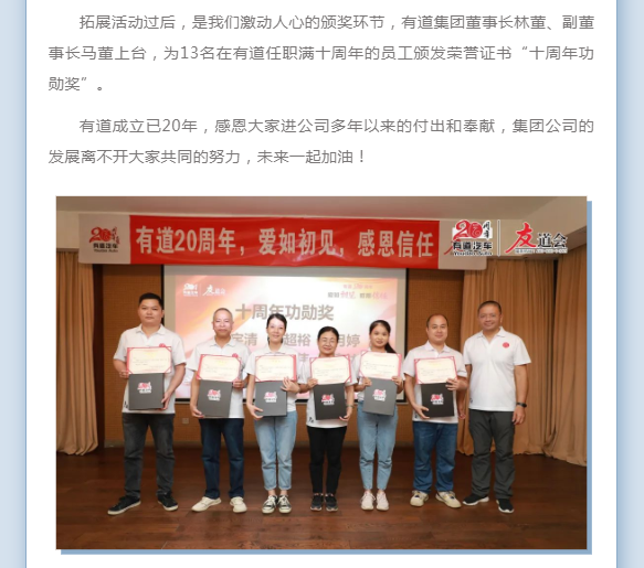 20年的汗水,20年的成就,鑄就了有道20年的輝煌。為了活躍公司職工文化生活,增強企業(yè)凝聚力和向心力,增強員工之間團結(jié)互助精神風貌,促進員工溝通交流,營造良好團隊氛圍,在有道20周年來臨之際,分別在兩廣一湖區(qū)域舉辦20周年慶員工團建活動。
