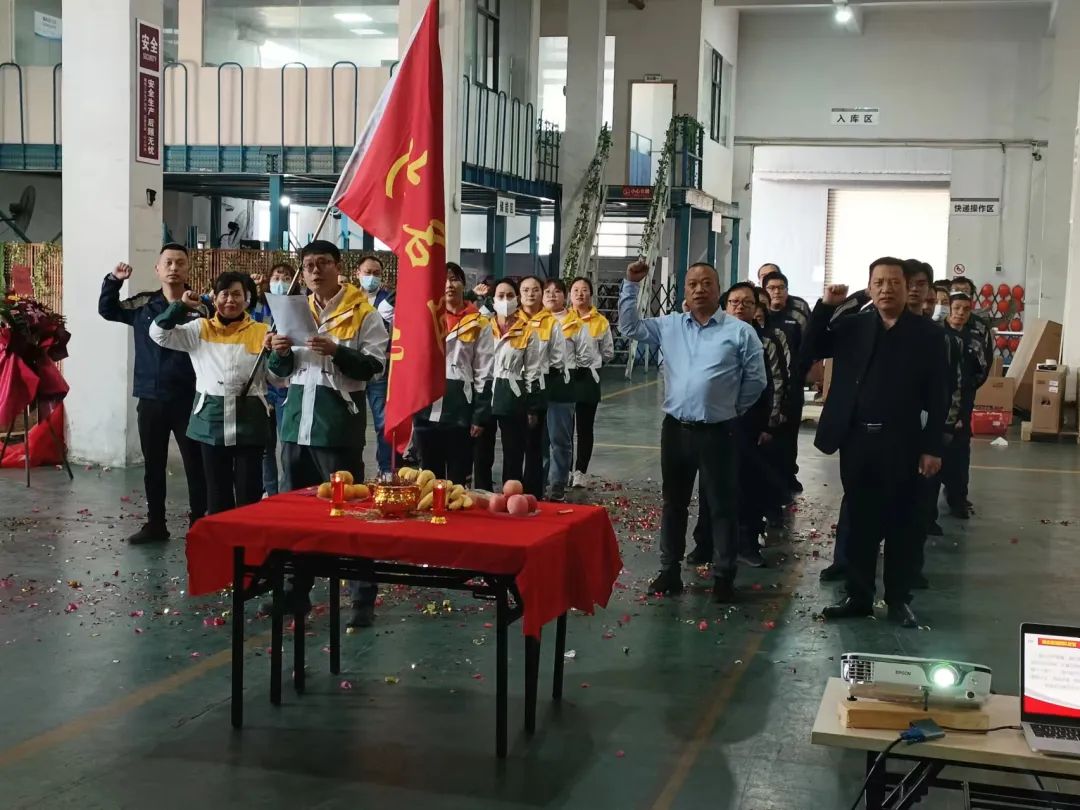 湖北名道團(tuán)隊(duì)現(xiàn)場(chǎng)授旗并進(jìn)行服務(wù)保障宣誓儀式:明確自己的工作目標(biāo)與使命,認(rèn)真對(duì)待每一份訂單,精準(zhǔn)發(fā)運(yùn)每一個(gè)備件,用心服務(wù) 每一個(gè)客戶, 使命必達(dá),亮劍沖鋒!