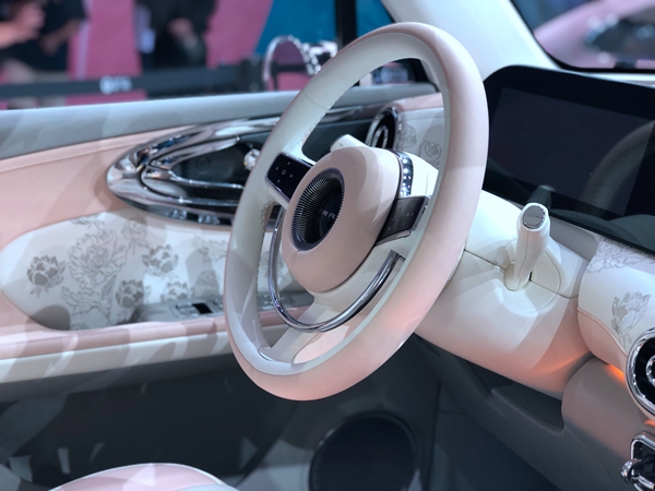 粉白皮質雙輻式多功能方向盤,皮質座椅之上印有玫瑰花紋,還有以鏤空以及“鉆石”包圍工藝設計的中央扶手箱,處處透著精致優(yōu)雅氣息。