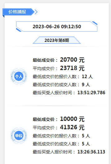 個(gè)人最低成交價(jià)為20700元,最低成交價(jià)成交人數(shù)為9人,個(gè)人平均價(jià)格為23718元/人;單位最低成交價(jià)為10000元,最低成交價(jià)成交個(gè)數(shù)為5個(gè),單位平均價(jià)格為41326元!