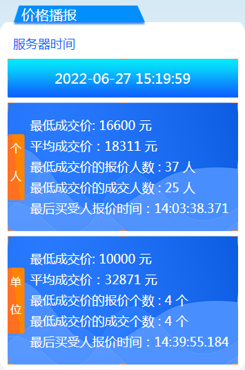 個(gè)人最低成交價(jià)為16600元,最低成交價(jià)成交人數(shù)為25人,個(gè)人平均價(jià)格為18311元/人;單位最低成交價(jià)為10000元,最低成交價(jià)成交個(gè)數(shù)為4個(gè),單位平均價(jià)格為32871元/人!